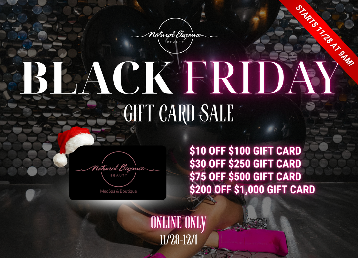 Treat yourself or someone special with the gift of beauty - because glowing skin is always in season! This Black Friday weekend, enjoy up to $200 in savings on Natural Elegance Beauty gift cards. Whether you're stocking up for your next treatment or checking off your holiday gift list, now is the perfect time to save big! 🎁✨